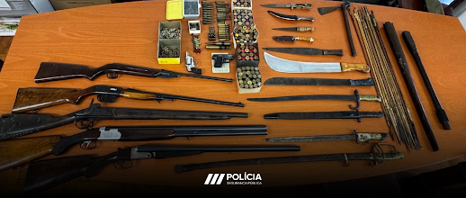Após ser identificado cabalmente pela vítima e testemunhas, por se encontrar sem documentos, houve necessidade de deslocação à casa do suspeito a fim de recolher a sua identificação. O mesmo foi questionado se dispunha de objetos ilícitos no interior da habitação, tendo este respondido afirmativamente. Foi possível verificar a existência de várias armas, tendo estas sido apreendidas. O suspeito foi detido e recolheu às celas de detenção.